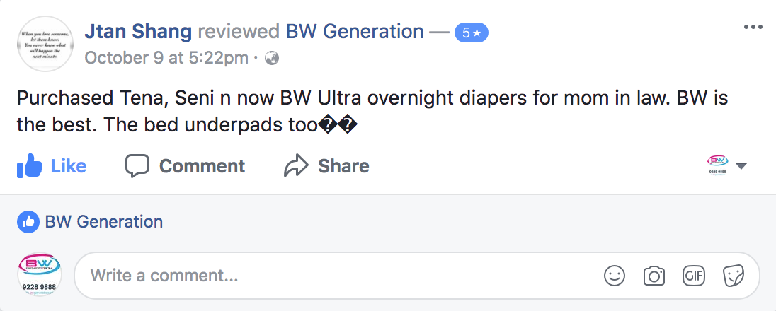 I have been a client of BW Generation since 2017. Their staff are always friendly and purchases are easy to make via electronic means. Deliveries are always on time and as committed. I have full confidence that the BW Generation Ultra diapers are the best among all the different brands that we have tried