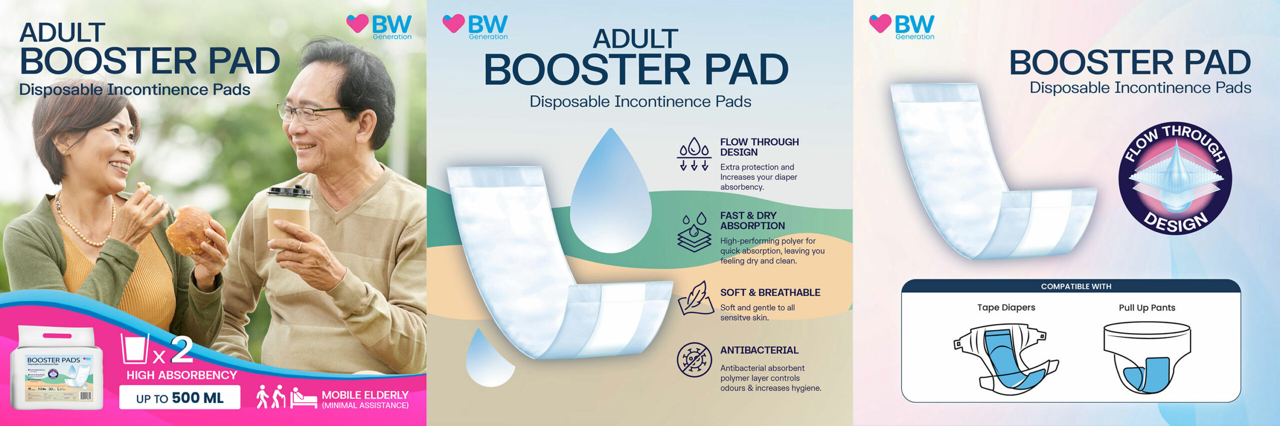 Our BW Booster Pad helps protect you from bladder leaks by turning the liquid into gel. Once the pad has reached its full capacity, excess liquid will flow through to the underlying disposable absorbent pull-up pants or taped diaper.
